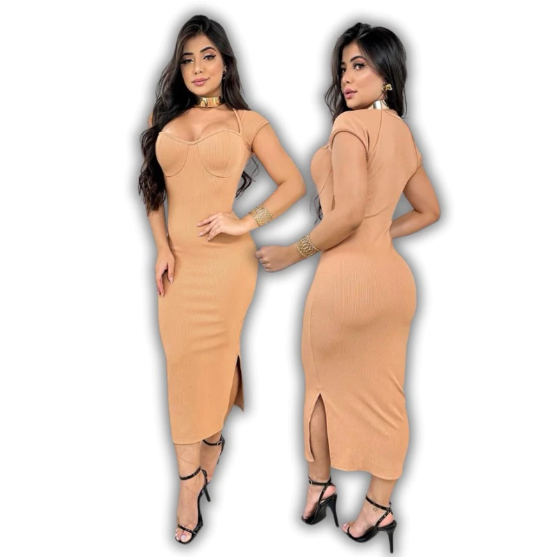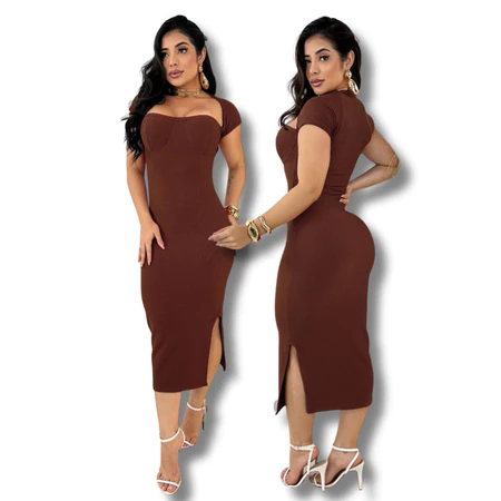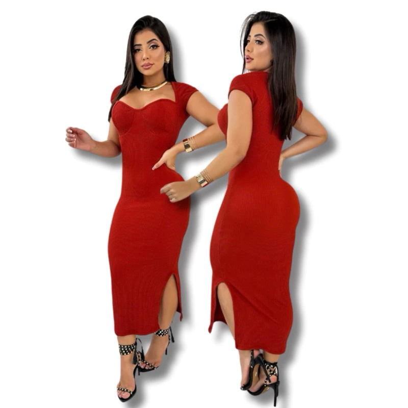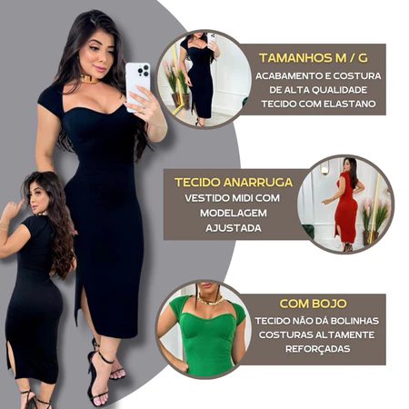 Vestido midi de manga curta, liso, com bojo e fenda lateral, perfeito para o look evangélico.